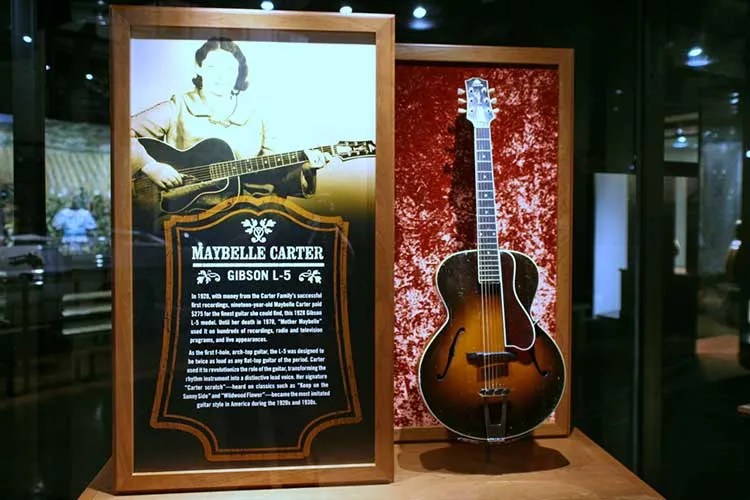 Maybelle Carter exhibit showing her 1928 Gibson L-5 acoustic guitar