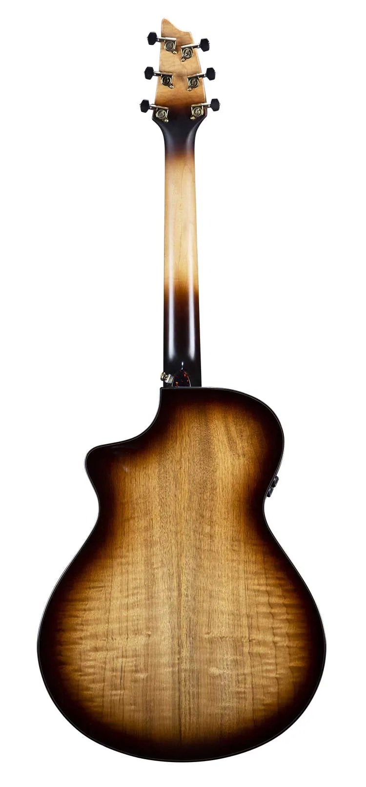 The neck sports the same finish as the body, but with a slick, easy-playing satin matte texture instead of a high-gloss sheen. The gold strap button on the neck heel makes it easy to go straight to the stage. Even with all the other design decisions that make a guitar identifiable, a unique headstock is often a maker’s calling card, and Breedlove’s signature asymmetrical headstock design is one of the easiest to spot.