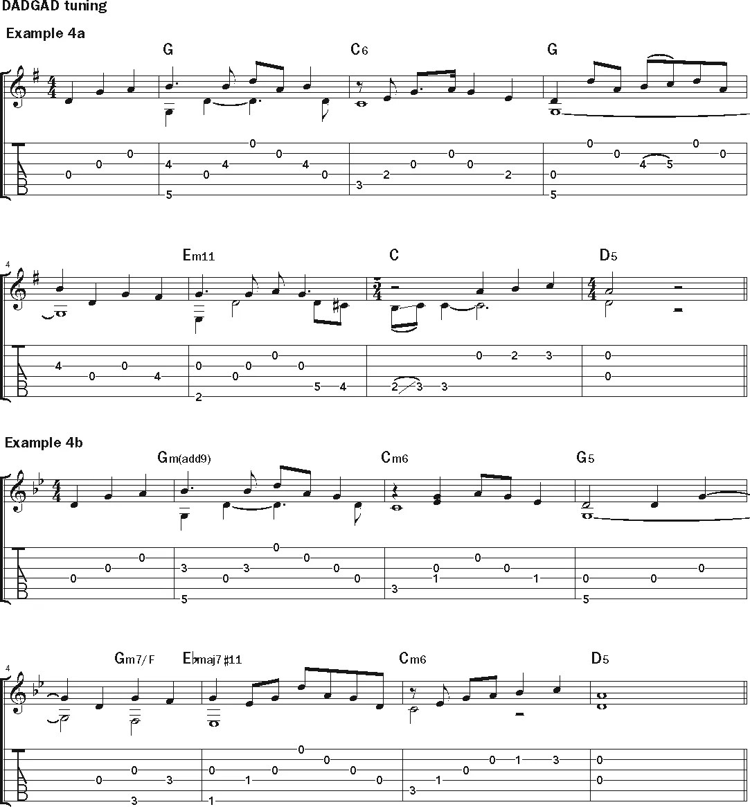 In his video, he runs through the process with the traditional song “The Water Is Wide,” creating off-the-cuff versions in multiple keys and tunings. Initially tuned to DADGAD, he works out the melody in G major, adds bass notes, and fills out the sound with additional chord tones. Play his opening phrase in Example 4a, then check out the minor version in Example 4b—quite a dramatic change, and full of potential for development.
