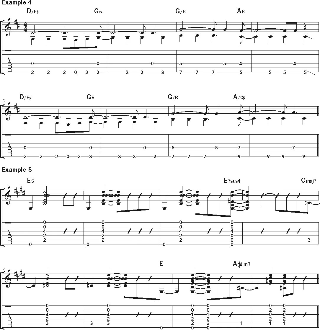 One of the album’s most intense tracks is “Where the Long Line Leads.” “It’s meant to be a cross between something like an old bluegrass tune and garage punk,” Watkins says. In Example 5, based on the beginning of the verse, let the top strings ring as you switch from E5 to E7sus4, Cmaj7, and E.