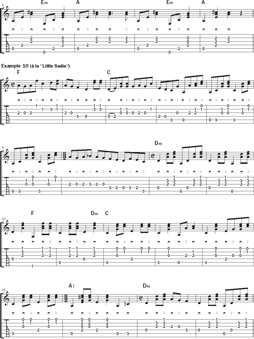 Example 10 tips its hat to Watson’s intro and first verse for “Little Sadie.” He plays the flatpicked melody and the verse rhythm many times with some variations, and the first pass serves as a good model for what he does later in the song. Notice how throughout the melody passage Watson includes quick boom-chuck strums that give the listener context to the chords, like the partial D minor in the second half of bar 2, the partial C in the first half of bar 3, and the more obvious C in bar 5. This is the essence of Watson’s combined rhythm and lead approach, where he plays both melody lines and boom-chuck rhythm simultaneously.