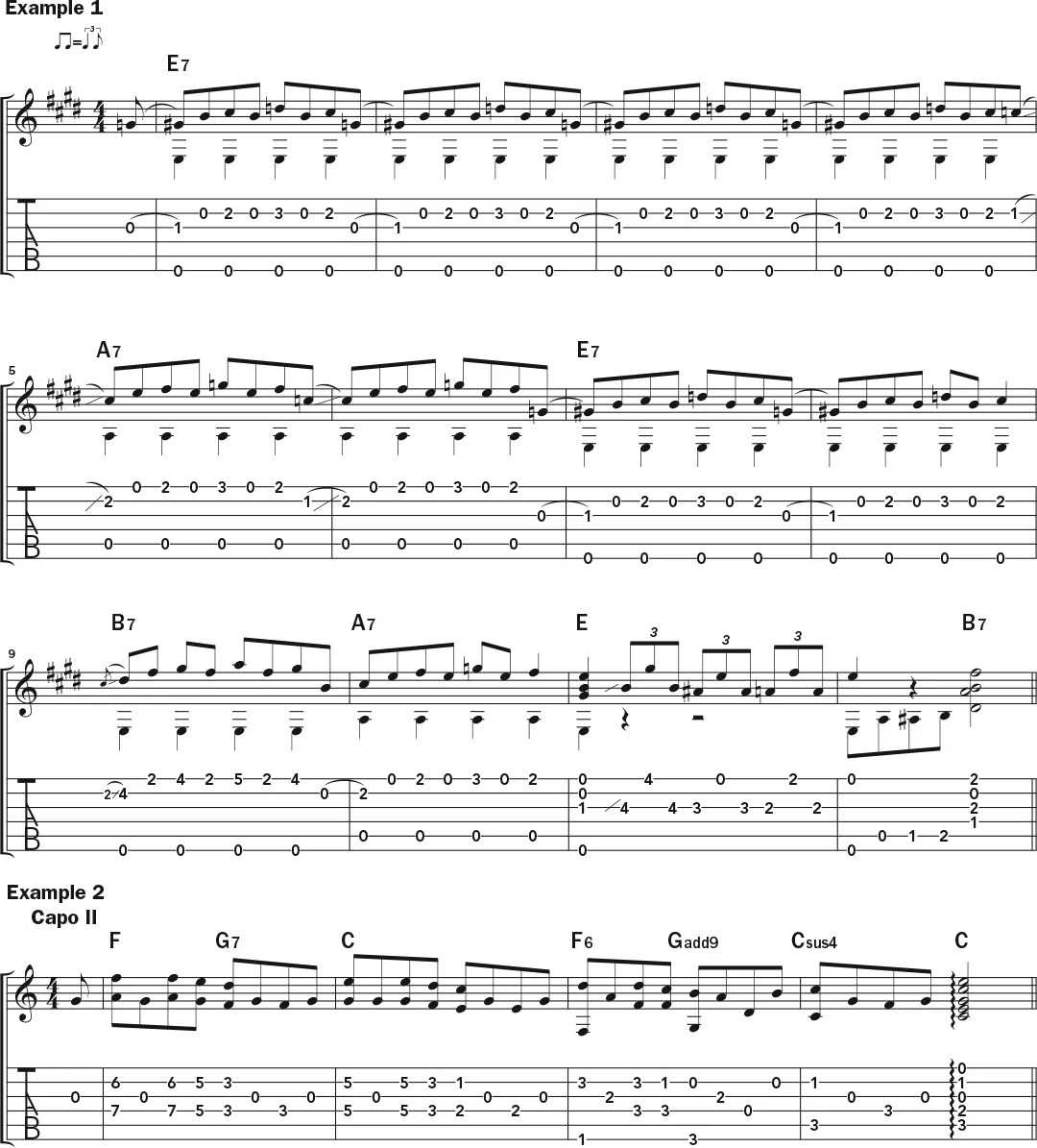 Example 1 shows a 12-bar blues pattern that McGhee taught, and used in “Good Morning Blues” and other songs. Play either a monotonic bass, as notated, or double up the bass notes with a shuffle rhythm (see the video for a demo). On top, play single notes that outline the E7, A7, and B7 chords—McGhee’s term for this was “breaking up the chords.” Interestingly, McGhee did not typically play a B bass note under the B7 chord; he just continued the six-string E on the bottom (as in measure 9), muted so it didn’t clash too much with the harmony.