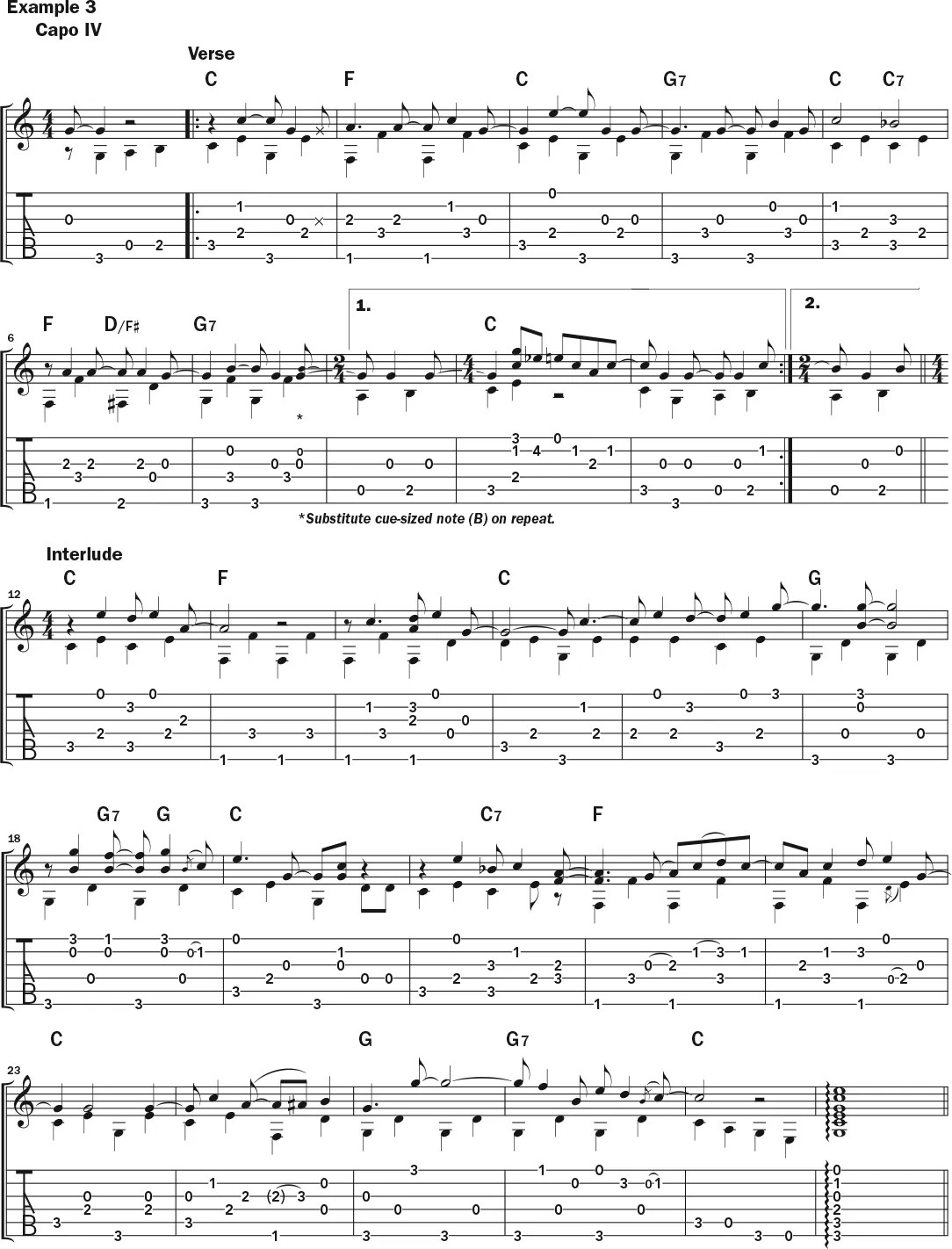 A few years after Hurt passed away in 1966, Traum wrote the tribute song “Mississippi John,” and eventually recorded it with his brother, Artie, for the 1975 album Hard Times in the Country. “Mississippi John” remains in Happy’s repertoire; on YouTube you can find a 2014 live version with Traum accompanied by jug band maestro Jim Kweskin. Traum fingerpicks in a classic Hurt style, using C shapes (capo 4 to sound in E) with an alternating bass. Example 3 shows the verse accompaniment (as you’ll see in the video, he adds some variations in the second pass) and the instrumental interlude, which is based on Hurt’s version of “My Creole Belle.”