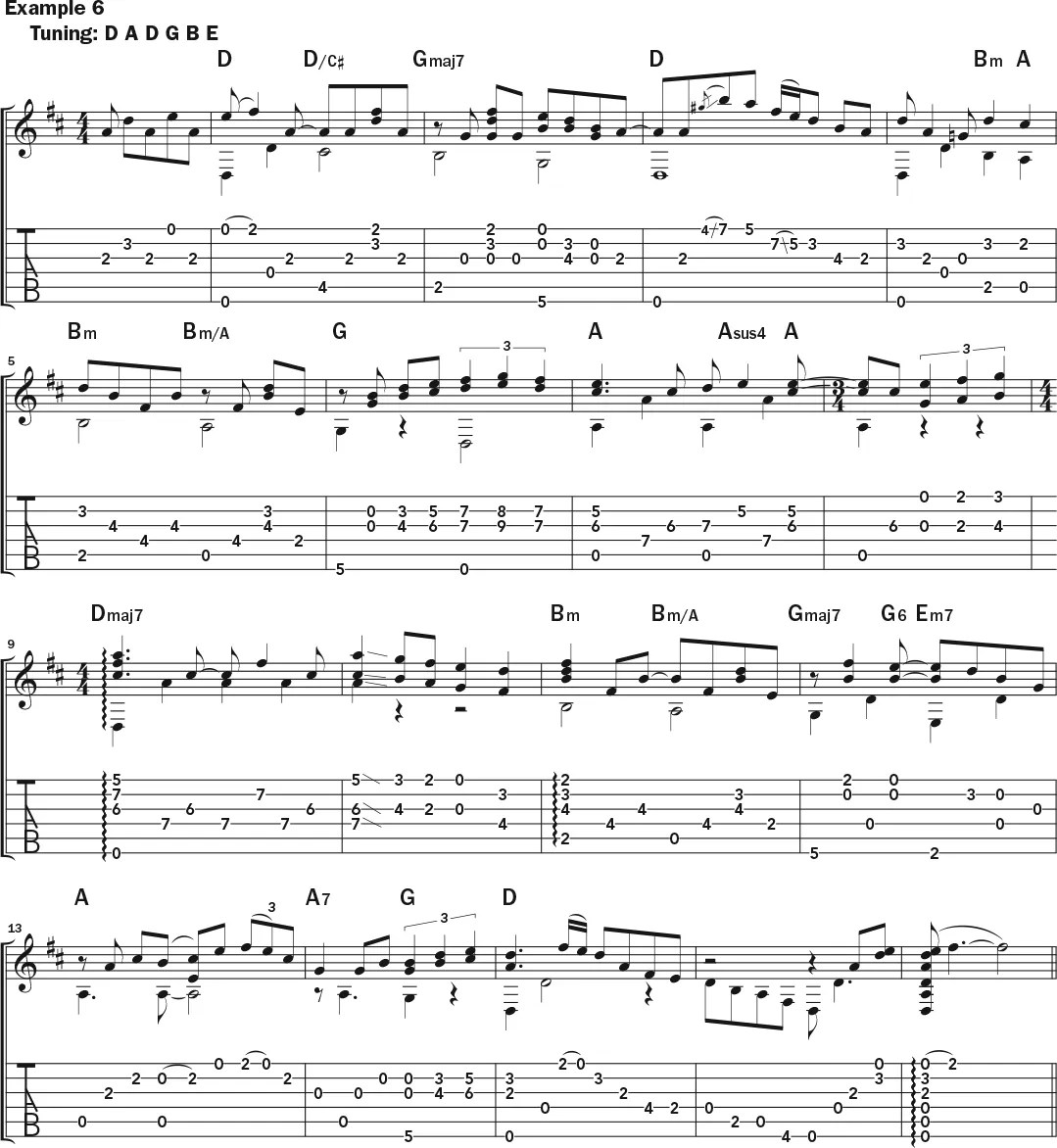 Example 6 shows one instrumental pass through “The Water Is Wide.” The picking style, he says, is “the antithesis of the steady thumb,” with bass notes often ringing out for two beats or skipping beats entirely. In measures 3, 6, and 9, shift up to fifth position, taking advantage of the open-string bass notes. Bars 6, 8 and 14 each include a quarter-note triplet, adding a nice flow to the ascending melody lines.