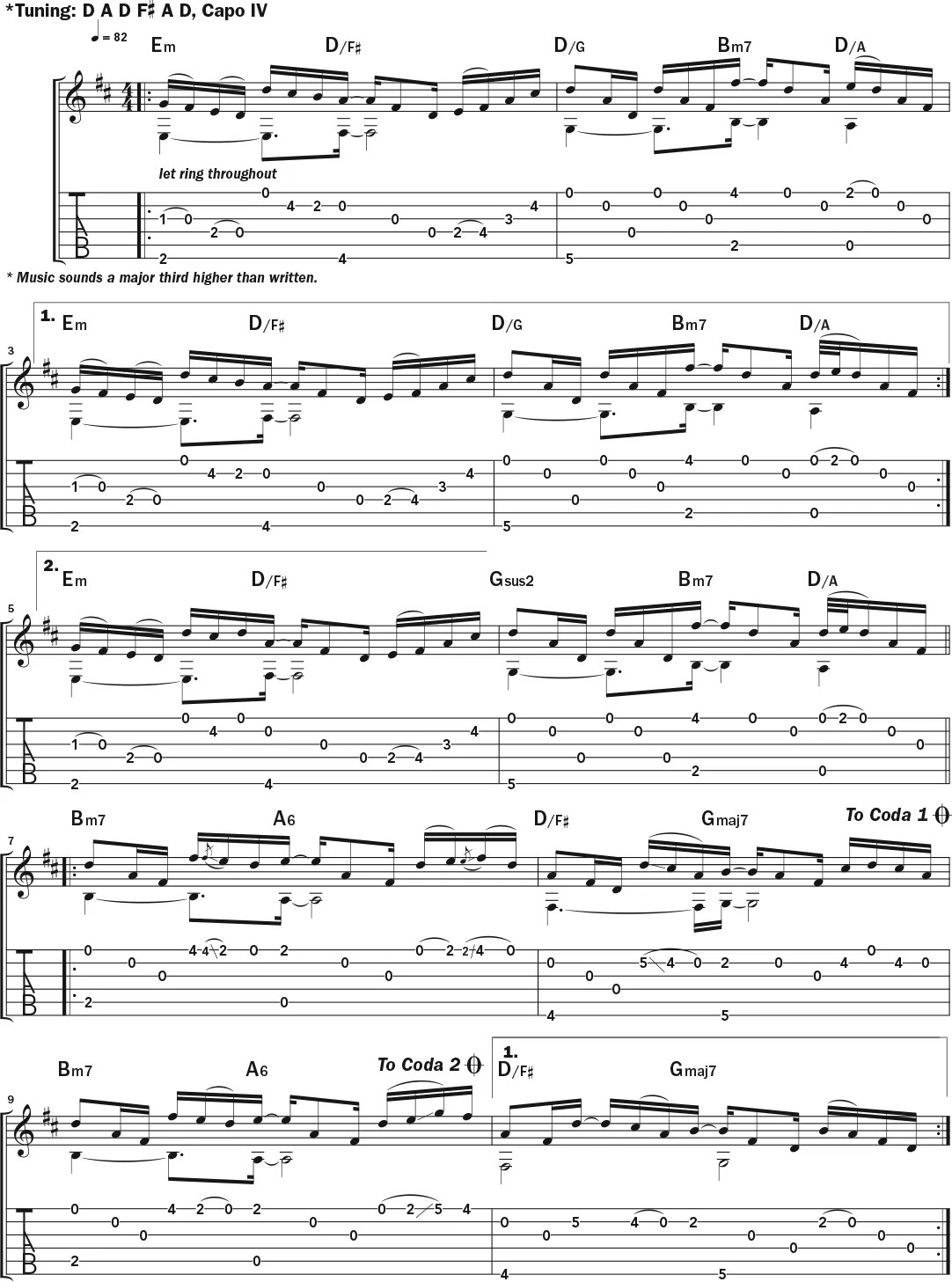 If open-D tuning is new to you, then the chord shapes will obviously be unfamiliar, so your first order of business is to get these grips under your fingers. (For a full lesson on fingerpicking in open-D tuning, see the Weekly Workout in the June 2015 issue of AG.) Fingerings are often a matter of personal preference, so mark up the notation with those that work best for you. For example, you might play the first chord, Em, with your second finger on string 6, fret 2; third finger on string 4, fret 2; and first finger on string 3, fret 1. Also, be sure to hold down each chord grip for as long as possible throughout, for a ringing effect.