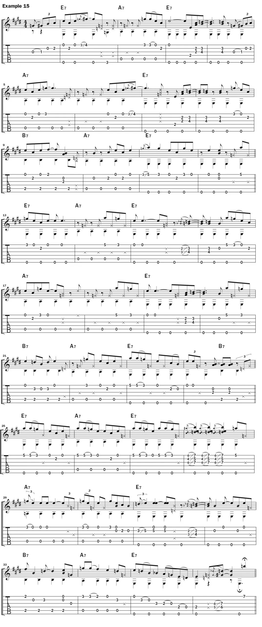 Example 15 brings it all together in your longest figure yet—three complete choruses on the 12-bar blues. I hope that gives you plenty of ideas to keep developing your soloing by making it more organized and musically satisfying. In the next and last lesson in this series, I’ll show you more about how to use the 12-bar form as a road map for improvisation.