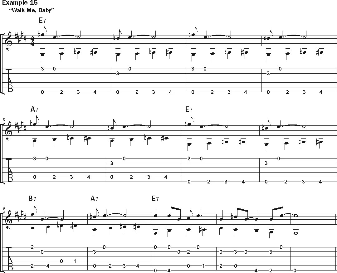 Now you’re ready to assemble all of this into a full 12-bar blues in E. “Walk Me, Baby” (Example 15) plugs one of our one-measure bass-line/blues lick moves into each measure of the progression, until the last two measures.