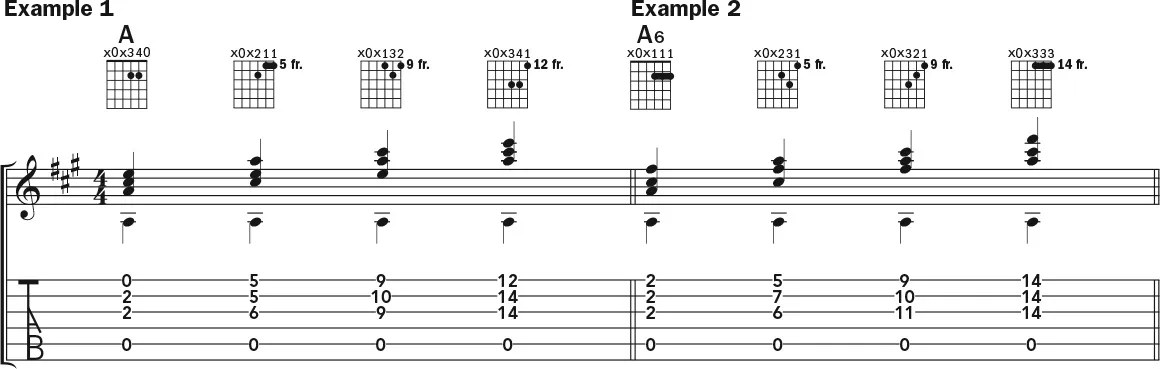 Example 2 transforms Ex. 1’s A chords to A6. By the way, if you think these A6 voicings sound minor on their own, you’re right—the A6 chord (A C# F#) shares the same notes as F#m (F# A C#).