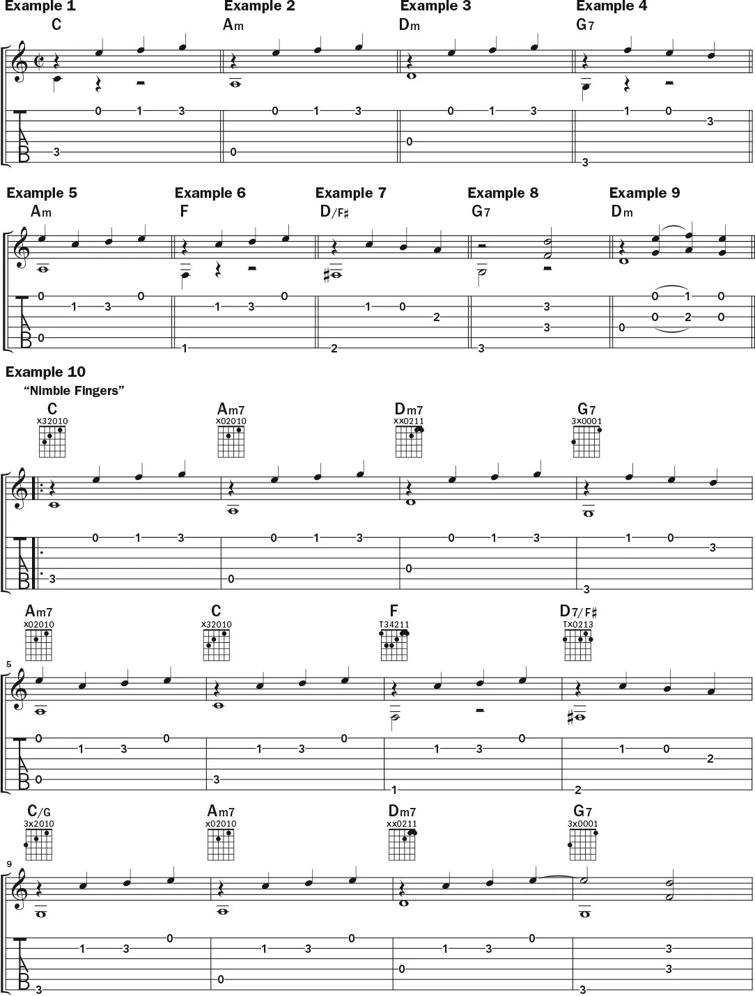 Now try the full “Nimble Fingers” exercise (Example 10), which includes all of the preceding figures. Play it slowly at first, making sure that none of the bass notes overpower the melody, again, letting the notes ring as long as possible. If any measures give you trouble, be sure to practice them until you can play them seamlessly. The beauty of this piece is that the bass line works together with the melody such that the harmony is clearly defined, even though you aren’t playing full chords. However, it can also be satisfying as a duet—just find a partner and take turns playing the melody and accompaniment, using the chord frames shown above the staff. Note the use of the Am7, Dm7, and D7/F# chords, which helps keeps things colorful, harmonically speaking.