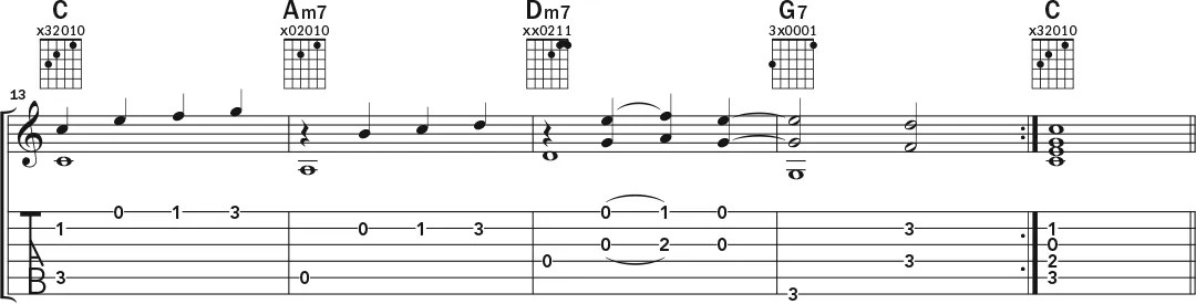 Some other chords, like Am (Example 2) and Dm (Example 3), use an open string as a root. In these instances, you can easily play the bass note for the duration of the measure. You might have noticed that these different chords share the same three-note ascending melody (E–F–G), but when you get to the G chord (Example 4), the melody notes move in descending order.