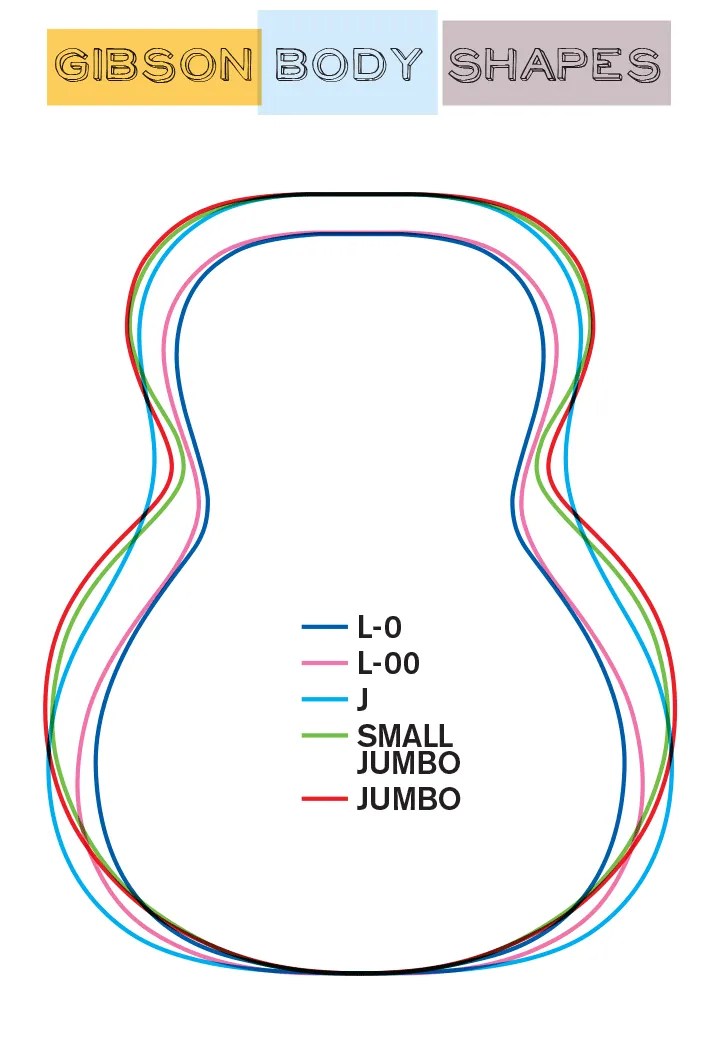 a diagram showing the different shapes and sizes of Gibson acoustic guitar bodies