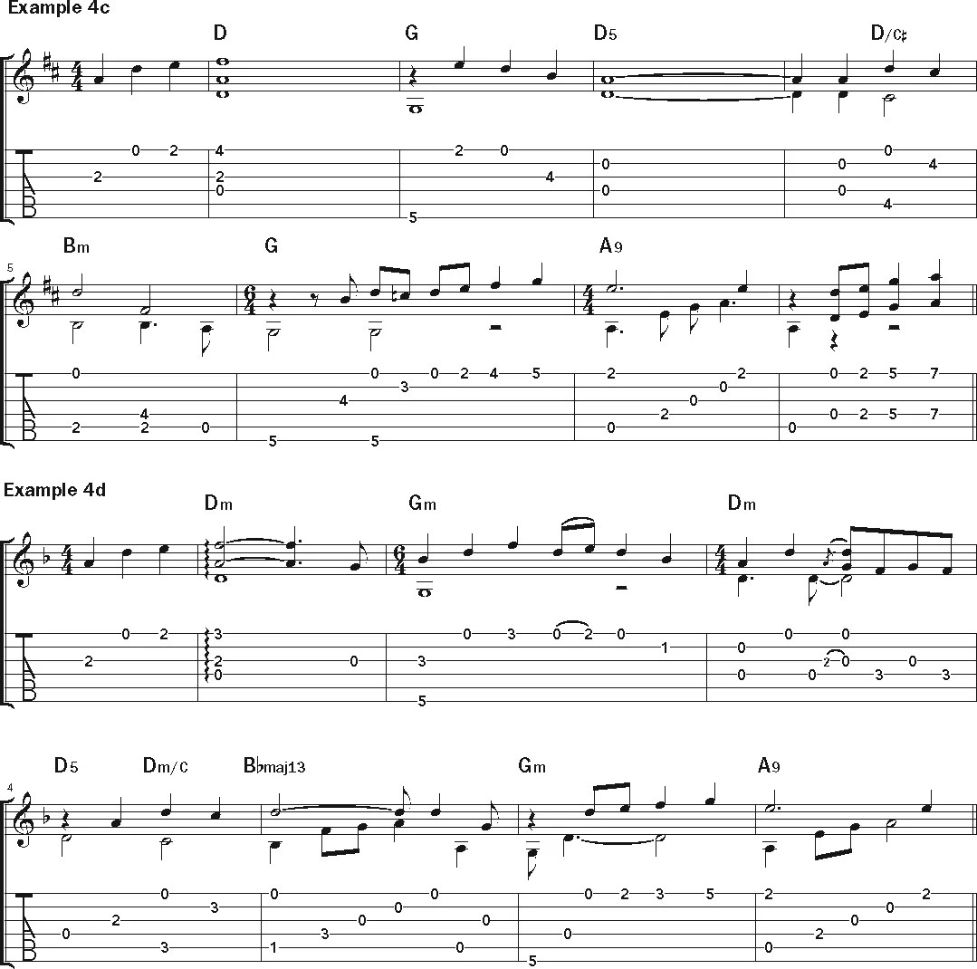 In his video, he runs through the process with the traditional song “The Water Is Wide,” creating off-the-cuff versions in multiple keys and tunings. Initially tuned to DADGAD, he works out the melody in G major, adds bass notes, and fills out the sound with additional chord tones. Play his opening phrase in Example 4a, then check out the minor version in Example 4b—quite a dramatic change, and full of potential for development.