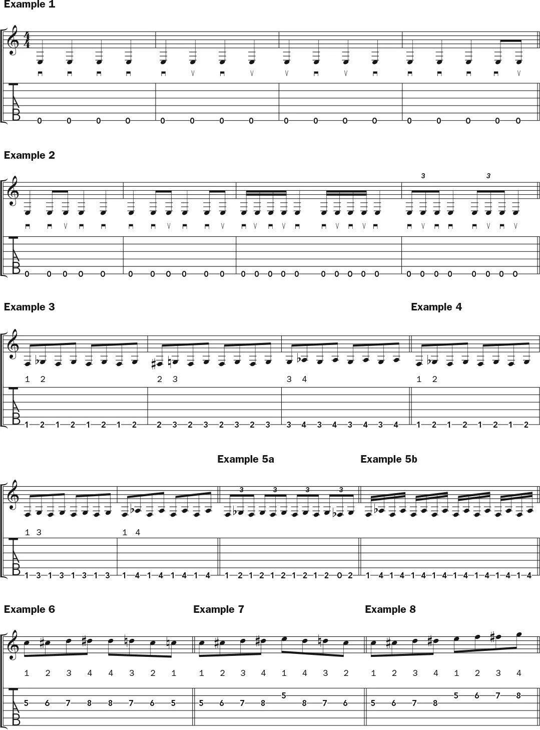 Remember, once you have these warmups comfortably under your fingers, you can increase the degree of difficulty by varying the picking patterns—one at a time, of course—just like you did with examples 5a and b. Countless musicians use these and similar techniques for warming up their hands (and arms and minds). This little investment of time at the beginning of each practice session will yield improved accuracy, speed, and satisfaction in your playing. Happy warmups!