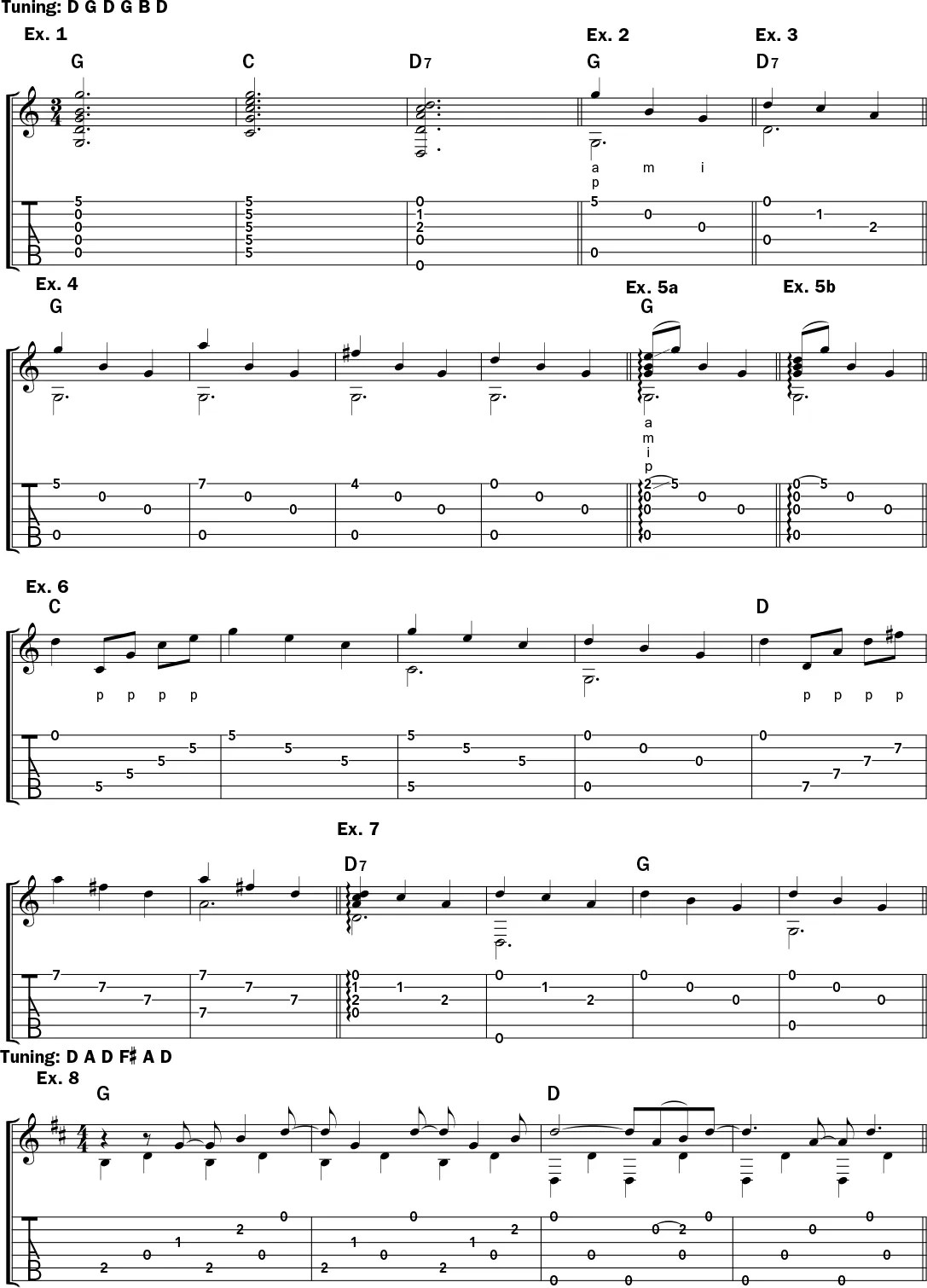 To get into open G, also known as Spanish tuning, lower strings 1 and 6 down a step, to D, and string 5 down a step, to G. Cotten’s “Spanish Flang Dang” serves as a good introduction to this tuning, as the fretting-hand fingerings are straightforward, with only three chords (G, C and D7), all shown in Ex. 1 .