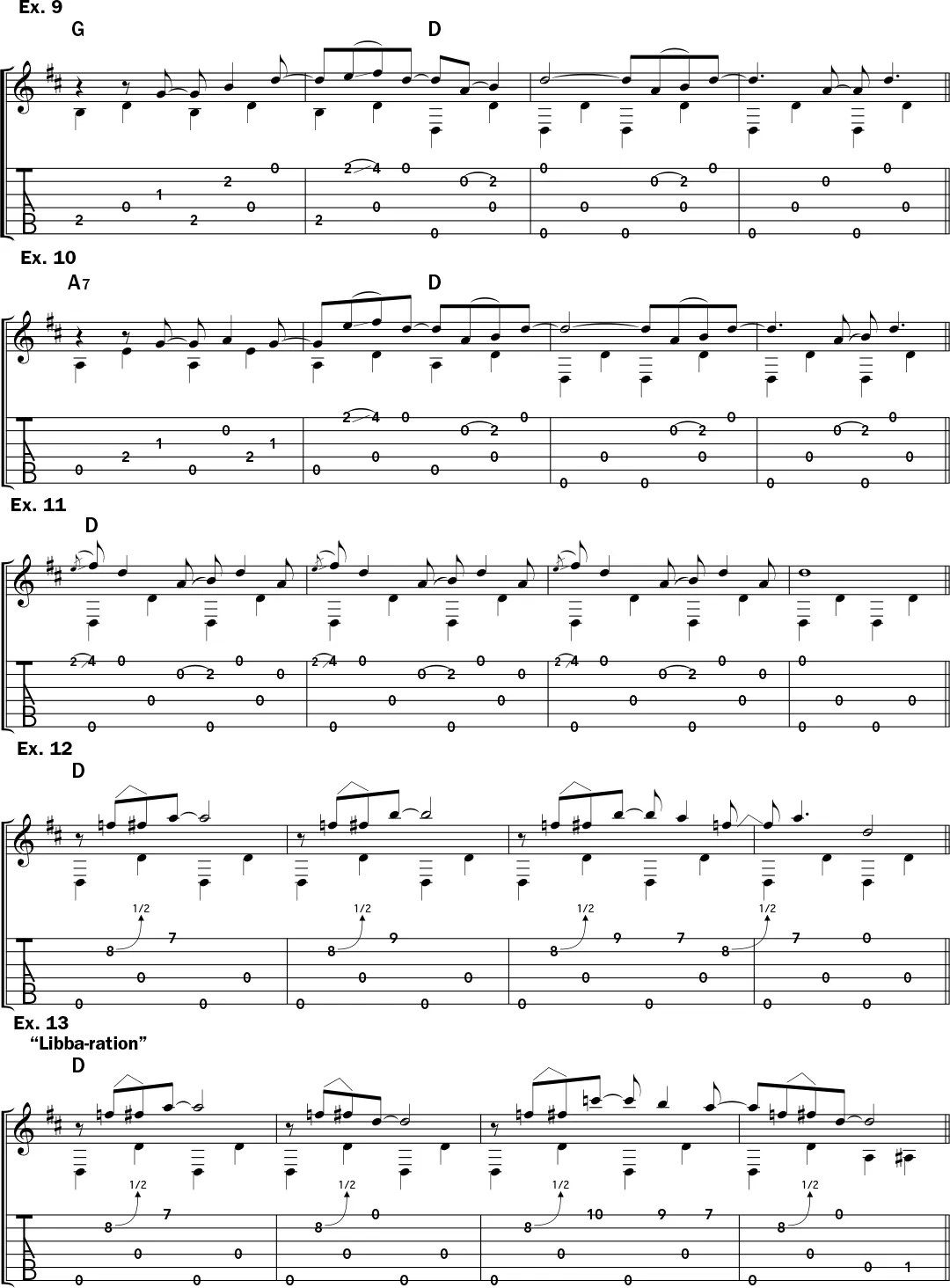 Ex. 9 shows a variation that uses a slide from E to F#, making for a quicker transition back to the D chord. Use your second finger for fretting both the slide and the following hammer-on. The hammer-on-and-slide motif is duplicated in Ex. 10, this time going from the V chord (A7) to the I.