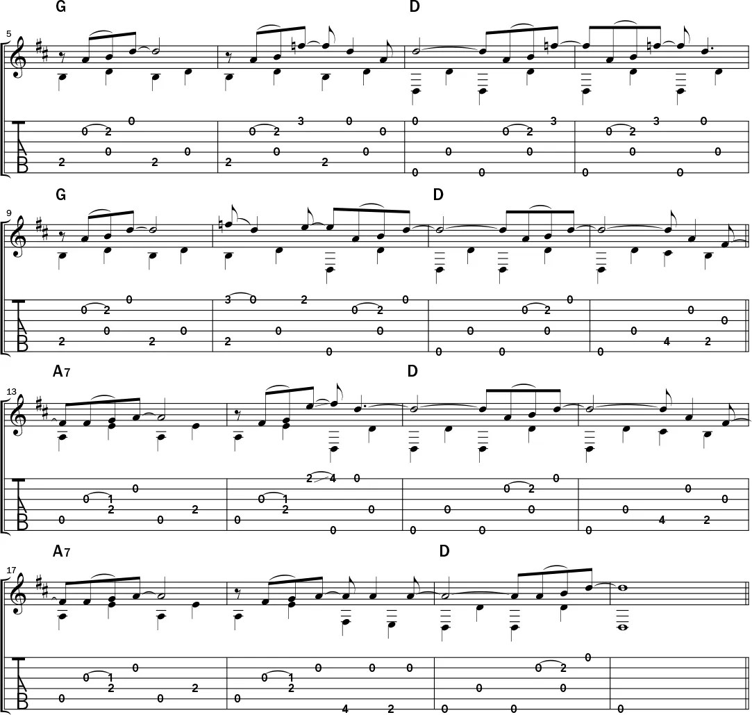 The first four bars are all built on the I chord. This section takes one of the motifs from “Vastapol” and expands on it with melody notes at frets 10 and 9 on the first string. The next eight-bar section travels back and forth between the IV (G) and I (D) chords. It has a call-and-response flavor with the same melodic component played underneath the alternating bass for each chord.