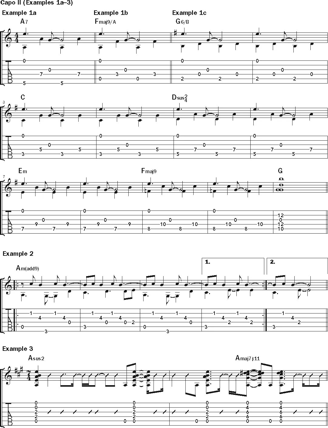 Start with the A7 in Example 1a, which is like a fifth-position A with the top three strings left open. Play the down-stemmed notes with the pick/thumb and the up-stemmed notes with your fingers. In the verse, he dips down to Fmaj9/A (Example 1b) and back up to A7. Then go to the Fmaj9/A again and follow with the sequence in Example 1c, eventually moving up the neck to the tenth fret. Every one of these chords includes the open third string, creating a drone that holds the whole pattern together.