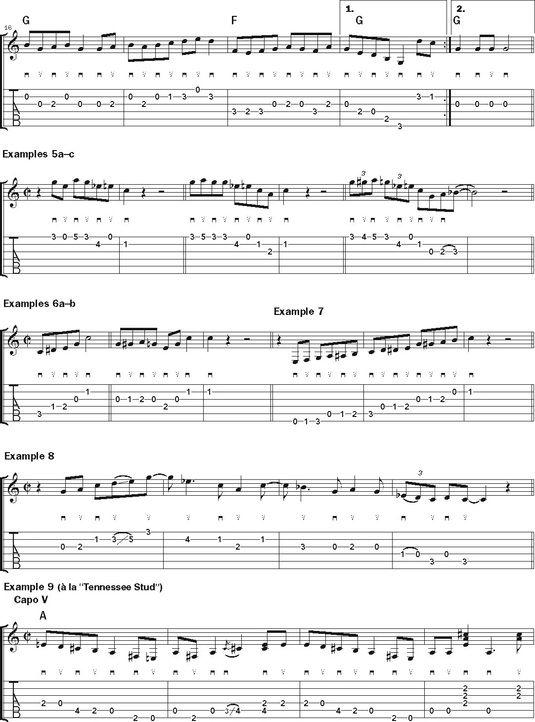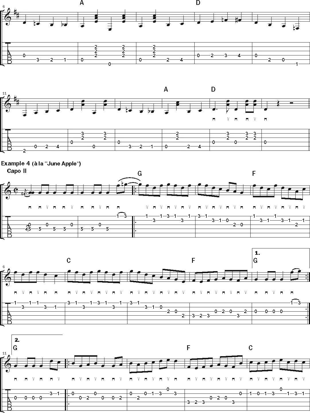 “June Apple” is a jam favorite, and Watson’s rendition on Doc Watson in Nashville: Good Deal! (1968) is the standard approach for guitarists (Example 4). He kicks it off with “taters,” a two-bar shuffle that sets the tempo and tells the other musicians when to come in. The tune itself then starts with a pickup into bar 3 using a quick hammer-on. The key to playing this tune—or any fiddle tune in the style of Watson—is to maintain alternating picking, coordinating downstrokes to happen on the beats and upstrokes to happen on the ands. Watson adopted his style by mimicking fiddlers, and alternating picking helps maintain the rhythmic bounce of the fiddle by having the heavier downstrokes land in coordination with the beats.