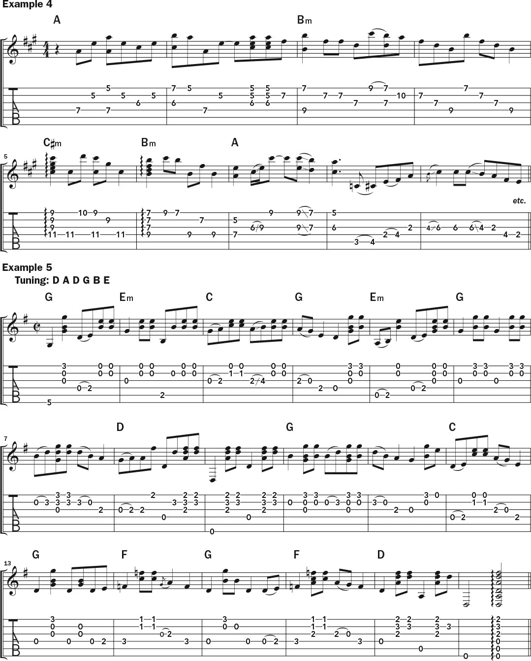 Example 4 shows the type of part thatTraum layered on top of Dylan’s rhythm guitar on “I Shall Be Released.”While Dylan played out of G shapes with a capo at the second fret (to sound in A), Traum added figures up the neck. On the C#m and Bm in measures 5 and 6, roll the chords by picking the strings quickly in sequence, low to high, with your thumb and fingers.