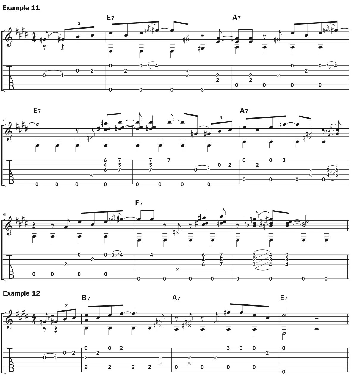 Variations like these leave plenty of room for some chord hits if you want them, and Example 11 shows where you might place them in the first eight measures of the 12-bar form. For the last four measures, you can use the same kind of rhythms, but you’ll have to switch up the notes to acknowledge the V chord (B7), as depicted in Example 12.