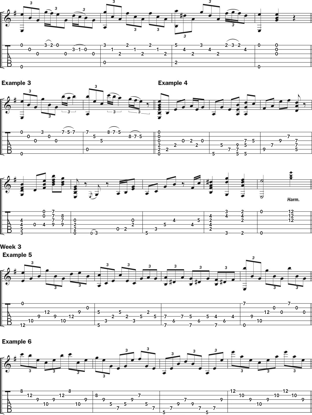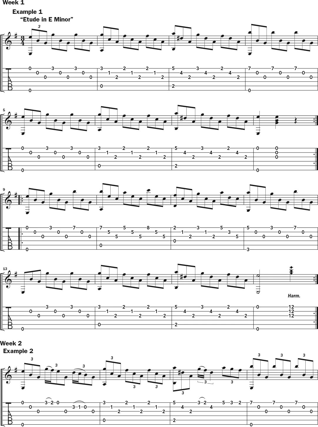 Begin the first week by familiarizing yourself with “Etude in E Minor,” as shown in Example 1. Although associated with the classical guitar tradition, this study also sounds wonderful on steel-string acoustic and provides ample potential for improvisation. It’s not necessary to already be able to play it flawlessly; in fact, I recommend beginning to improvise on this or any other piece while you’re still becoming familiar with its nuances.