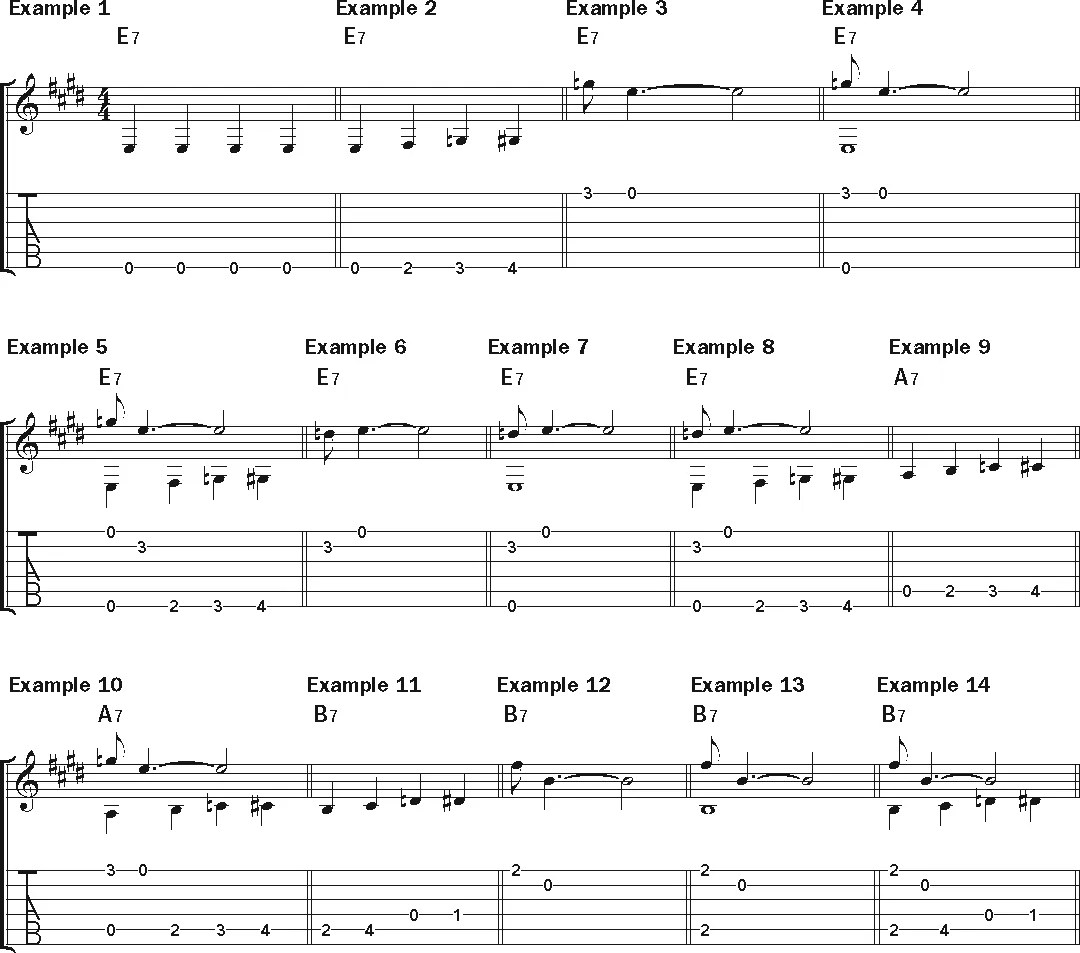 Now you’re ready to assemble all of this into a full 12-bar blues in E. “Walk Me, Baby” (Example 15) plugs one of our one-measure bass-line/blues lick moves into each measure of the progression, until the last two measures.